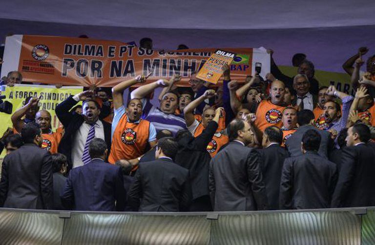 Assim como na semana passada, a sessão foi tumultuada. Houve bate-boca e troca de empurrões entre deputados e um grupo de manifestantes da Força Sindical protestou no plenário.