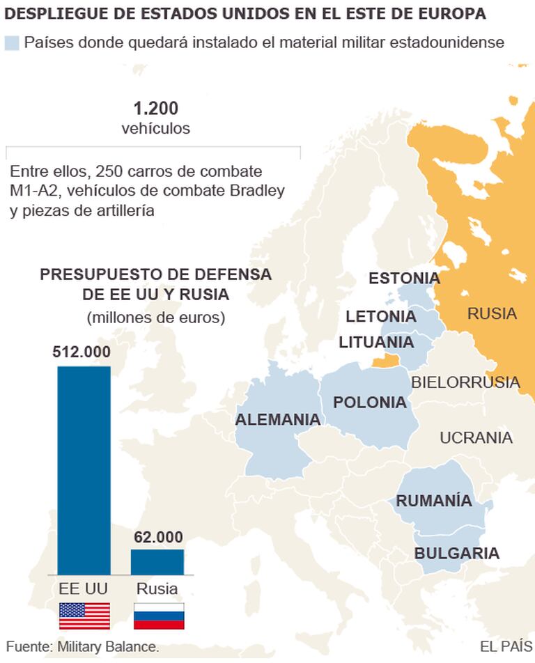 O deslocamento seria a primeira vez desde o fim da Guerra Fria, há mais de duas décadas, que os EUA estacionam armamento pesado nos novos países das OTAN no Leste Europeu, que integraram a esfera de influência da União Soviética.