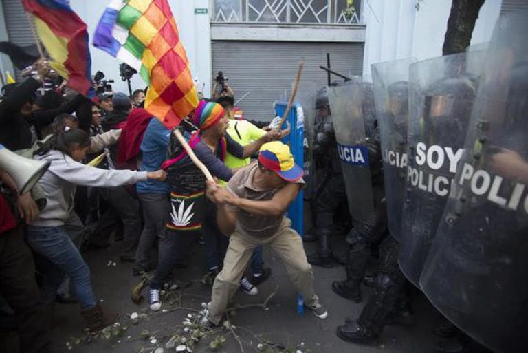 “Não se pode calar sobre esse tipo de coisa, alguém me empurrou e me entregou para a Polícia e quando a Polícia me pegou, balançaram minha cabeça, me pegaram pelo cabelo, me arrastaram e bateram”, denunciou Quispe visivelmente alterado e com o rosto e a roupa sujos. Sobre o outro preso, informou-se que foi levado a um hospital com sua companheira para que sejam tratados das agressões. Na coletiva de imprensa estavam todos os dirigentes sociais, que comunicaram que desde a manhã “radicalizaram” suas ações. “Quito deve continuar, queremos derrubar este sistema de abuso”, disse o presidente da Conaie.