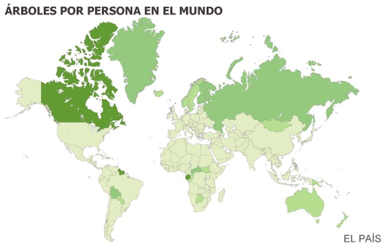 A distribuição por país revela uma enorme desigualdade, com ricos como a Bolívia com mais de 5.000 árvores por pessoa, e notoriamente pobres, como Israel, onde apenas há duas para cada habitante. Grande parte do contraste se deve a fatores naturais como o clima, a topografia ou as características do solo, mas também ao efeito inconfundível da civilização. Quanto mais aumenta a população humana, mais diminui a proporção de árvores. Em parte isso se explica porque a vegetação prospera mais onde há maior umidade, os lugares que os humanos também preferem para estabelecer terras de cultivo.