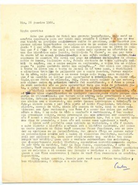 Também ajuda a ligar os pontos que desenham um país visto do exterior ficar sabendo que os escritores Fernando Sabino e Clarice Lispector eram amigos que se correspondiam – ele, de Nova York (onde era funcionário do consulado brasileiro), e ela, de Berna (onde viveu com o marido em sua carreira diplomática). Em 1946, ele se desculpa desesperadamente por ter demorado para responder uma carta dela, em que percebe-se que Clarice havia perguntado novidades do Brasil. O pouco que ele sabe relatar passa por um estudante morto no Rio de Janeiro quando, no largo da Carioca, “choveu bala sobre os comunistas”. “Tenho xingado muito o Getúlio”, diz o autor de O menino no espelho, depois de citar o “Pajé” (apelido do jornalista Otto Lara Rezende), quem andava tomando aos domingos “porres gigantescos, colossais”. Ou que Ziraldo mandava postais a Carlos Drummond de Andrade, como conta o blog do projeto.