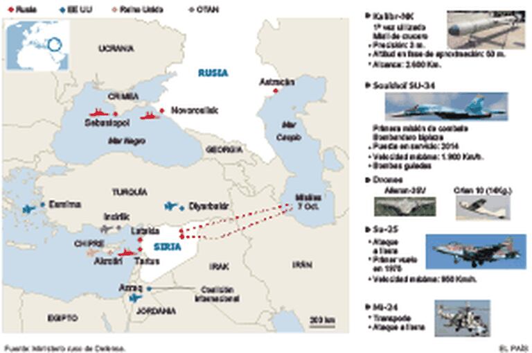 Assessores militares russos se integraram às fileiras do Exército de Assad para manejar os novos mísseis terra-terra que foram fornecidos a Damasco. O contingente russo se completa com forças especiais que protegem, junto com carros de combate e mísseis terra-ar AS-22, os aviões e helicópteros posicionados perto da cidade de Latakia. O Kremlin realizou ainda uma demonstração de força ao atacar posições da insurgência na Síria com mísseis disparados de navios de sua frota no mar Cáspio, a mais de 1.500 quilômetros do campo de batalha.