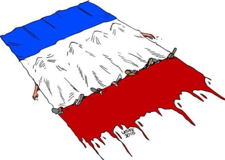 4. Vários mortos deitados no chão e cobertos com a bandeira da França protagonizam esta imagem do cartunista brasileiro Carlos Latuff.