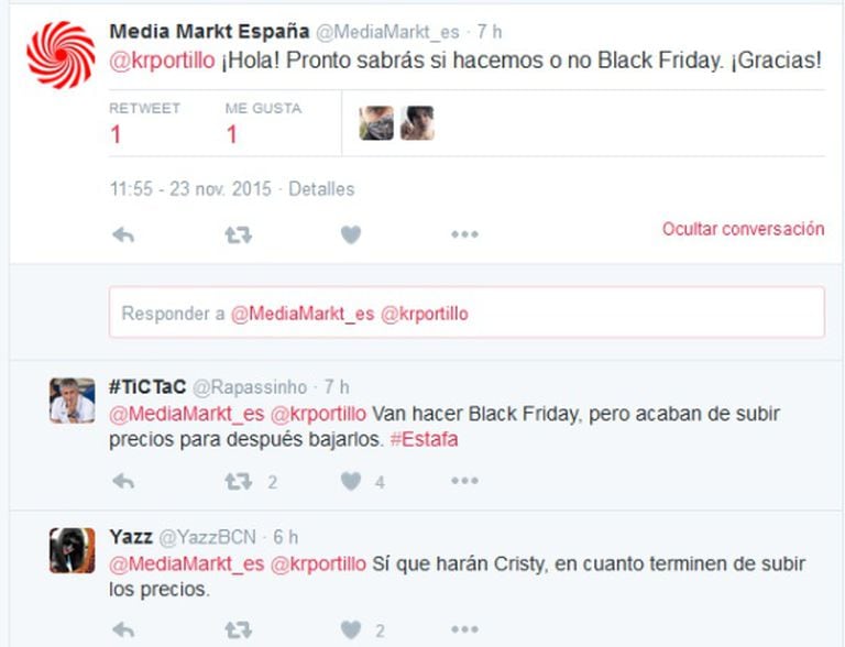 Foi precisamente numa polêmica como essa que se envolveu a Media Markt, loja de eletrônico europeia. No Twitter alguns compradores acusaram a rede de estar inflando os preços de alguns produtos, supostamente para depois abaixá-los na sexta-feira. A empresa, diante das perguntas de muitos compradores, afirmou na mesma rede social que os preços dos eletrônicos “flutuam” e que as mudanças não estão relacionadas com a black friday.