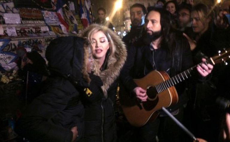 Com um casaco com capuz de pelo que escondia parcialmente o seu rosto, e acompanhada do filho David e do seu guitarrista Monte Pittman. Assim Madonna se apresentou por volta de 1h da madrugada de quinta-feira (22h de quarta em Brasília) na praça da República de Paris, símbolo da liberdade e local onde se concentram as homenagens às vítimas dos atentados terroristas de 13 de novembro. A cantora norte-americana interpretou várias canções junto dos transeuntes, que gravavam a cena atônitos e a acompanharam entoando clássicos como Like a Prayer, enquanto a aclamavam com gritos como “você é a rainha, nós te amamos!”. Ela havia convocado os fãs poucos minutos antes, usando uma foto no Instagram. “Vejo vocês lá. Agora mesmo, depois do show”, anunciava, numa iniciativa inédita em sua carreira, após concluir a primeira das duas apresentações no ginásio de Bercy. Um show marcado pela homenagem e lembrança às vítimas do ataque jihadista, no qual Madonna chegou a cantar acompanhada do seu filho, fez um discurso pela paz e terminou entoando A Marselhesa [hino francês] em um coro com os 18.000 espectadores.