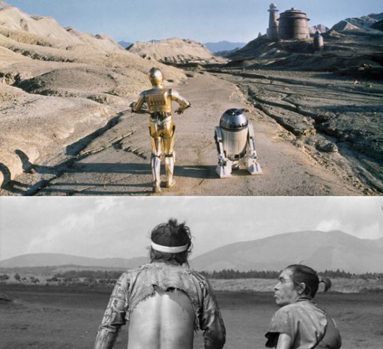 De Kurosawa tomou uma das grandes ideias para o primeiro filme, contar a história a partir do ponto de vista de dois personagens cômicos (C3PO e R2D2, na Fortaleza, dois camponeses que aparecem na foto que abre este artigo). E muito mais: as duas tramas compartilham a ideia de uma princesa e um personagem forte lutando para ultrapassar as linhas inimigas, a maneira como se passa de uma parte da história para outra com varreduras, a cena em que Luke e Leia cruzam presos a um cabo de uma porta para outra para não cair em um poço abismal...