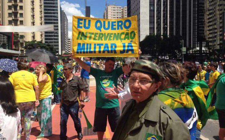 No pequeno grupo que pedia intervenção militar no protesto na Paulista estava o caminhoneiro Flavio, que justificava sua faixa dizendo que "quem quer mudança de verdade quer intervenção militar. Esse negócio de impeachment é conversa pra boi dormir. O Collor foi tirado do poder e tá aí roubando até hoje".