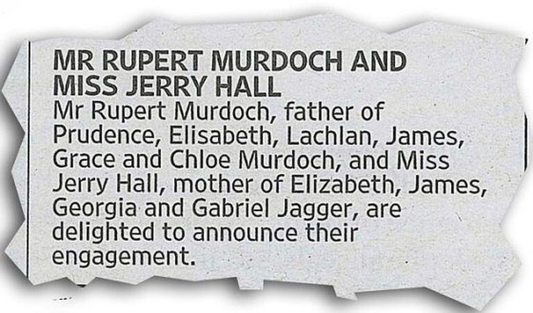 "O sr. Rupert Murdoch, pai de Prudence, Elisabeth, Lachlan, James, Grace e Chloe Murdoch, e a srta. Jerry Hall, mãe de Elizabeth, James, Georgia e Gabriel Jagger, estão encantados de anunciar seu noivado”, diz o texto.