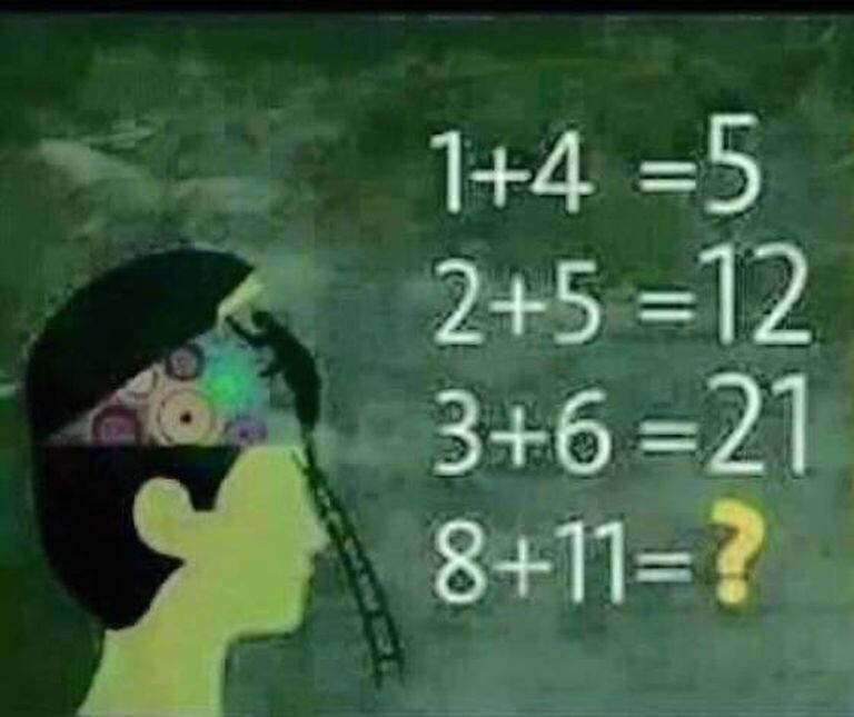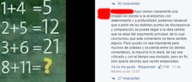 Há uma solução bastante provável, que é que ao 5 que resulta da primeira “soma” tem que se acrescentar os dois números seguintes os somando, 2 e 5, para chegar a 12, e que ao acrescentar os seguintes, 3 e 6, conseguiremos chegar a 21, o que parece confirmar nossa teoria. Assim, se a 21 acrescentamos o 8 e o 11, podemos chegar a 40, que por sinal é o resultado que mais se repetia no post do Facebook neste caso. De qualquer forma, meu coração está com esse comentário, que além do mais é um meme completo, e não apenas nesta rede social.