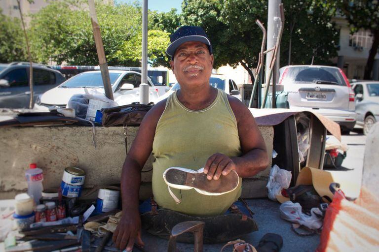 Ailton Pontes perdeu as pernas em um acidente de trem 37 anos atrás, hoje conserta sapatos numa rua de Rio de Janeiro