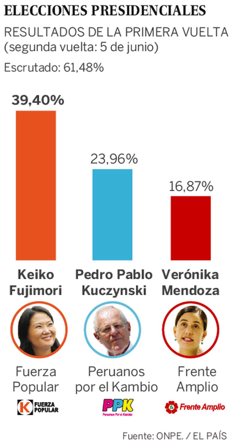 Keijo, que preferiria enfrentar Mendoza no segundo turno, mostrou-se eufórica perante seus apoiadores. “O novo mapa político demonstra que o Peru quer a reconciliação, não quer mais saber de disputas”. Kuczynski também estava exultante, com seus 77 anos, pulando e movendo os braços. Já se via como vencedor, embora tenha feito um apelo à prudência. Mendoza não se deu por vencida, embora houvesse muitas dúvidas entre os seus apoiadores. “Mostramos que é possível, fizemos isso sem recursos, sem dinheiro, de forma austera, com comprometimento, com o coração”.