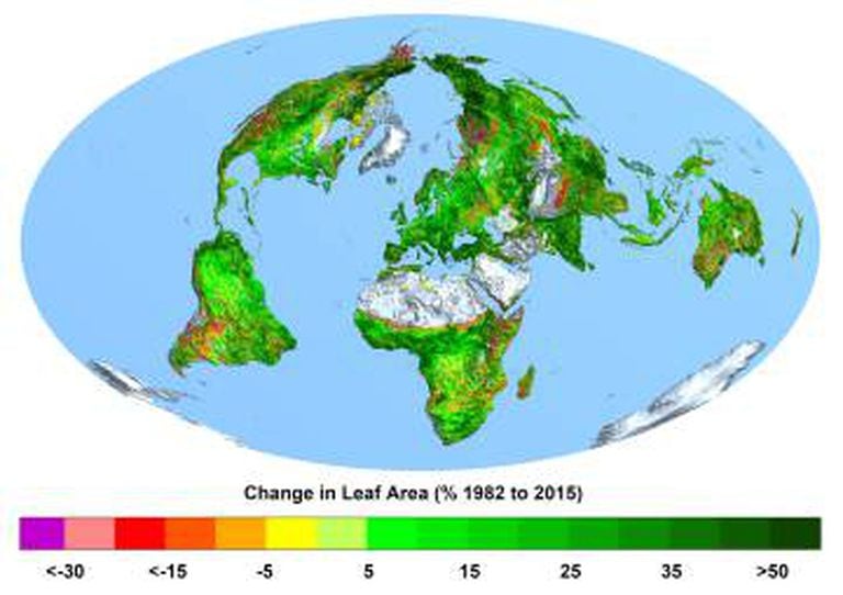 Sabemos muita coisa sobre as consequências da quantidade cada vez maior de gases de efeito-estufa acumulados na atmosfera. Estima-se que eles já representam quase 0,04% do ar que respiramos. Mas essa taxa seria maior ainda se não fosse a capacidade que as plantas possuem de atraí-lo. E são justamente os vegetais os mais beneficiados pelos altos níveis de presença desses gases tóxicos na atmosfera. Segundo um estudo publicado nesta terça-feira na revista Nature Climate Change, a Terra ganhou 36 milhões de quilômetros quadrados de superfície verde, o equivalente a três vezes a área da Europa ou duas vezes, aproximadamente, a dos Estados Unidos.