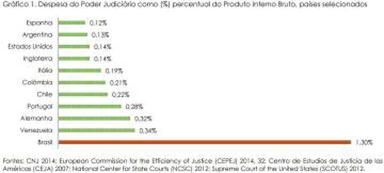 Segundo Luciano Da Ros, cientista político e pesquisador da Universidade Federal do Rio Grande do Sul (UFRGS), quando se fala em ajuste fiscal é comum que só se pense no poder Executivo, mas não há razão para que isso não seja feito também em outras esferas. “O Judiciário brasileiro tem uma autonomia enorme e pouca tradição de fiscalização externa; não à toa, o Conselho Nacional de Justiça (CNJ) foi criado há pouco mais de 10 anos, e o resultado disso é que há muito pouco incentivo para que os tribunais controlem seus próprios gastos e sejam eficientes”, comenta. Da Ros é coautor, ao lado do brasilianista Matthew M. Taylor, de um estudo que faz um comparativo da eficiência da Justiça brasileira com a de outros países. Uma das conclusões é que a despesa do Poder Judiciário brasileiro é a maior do mundo ocidental: 1,30% do PIB, enquanto os gastos de países como Espanha, EUA e Inglaterra ficam entre 0,12% e 0,14%.