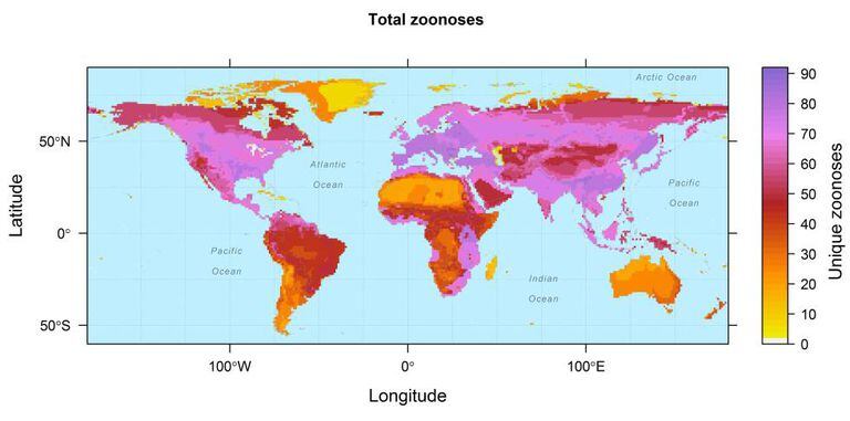 O mapa ainda está incompleto, já que inclui somente os mamíferos, deixando de fora por enquanto outros transmissores como aves e peixes e suas próprias zoonoses. Mas o trabalho, que estudou as 27 ordens de mamíferos terrestres, inclui milhares de espécies e dezenas de zoonoses provocadas por vírus, bactérias, fungos, protozoários e helmintos (vermes). Mapeando a distribuição geográfica dos hóspedes (possíveis transmissores) e a das zoonoses, os pesquisadores buscaram criar a base para antecipar um novo surto em uma região inesperada e a emergência de uma nova zoonose. O que encontraram desmonta alguns mitos.
