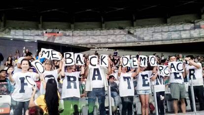 Um grupo de 12 torcedores que estava no estádio Mineirão, para ver a partida de futebol feminino entre EUA e França, tampouco pôde permanecer em seus lugares. Nove deles vestiam camisas com letras estampadas. Posicionadas na ordem corretas, formavam a frase “Fora Temer”. Além disso, também levavam cartazes no qual se lia “back democracy”. O EL PAÍS não conseguiu contatá-los. Ao portal UOL, Eduardo Ferreira, que estava no grupo, explicou: “Os seguranças vieram e falaram que não poderíamos ficar. E não queríamos brigar, estávamos acompanhados de muitas senhoras e até de uma criança de oito anos. Entregamos os cartazes primeiro, e depois a polícia veio nos retirar. Embaralhamos as letras, para continuar dentro do Mineirão, mas não aceitaram. Nos retiraram mesmo assim”, explicou este economista. “Vieram dois agentes conversar, mas o túnel estava cheio de polícia. Até tentaram nos qualificar, mas não teve como. Tirei a camisa com a letra e coloquei a do Galo, então não tinham a motivo para me qualificar. Então fomos embora”, completou.