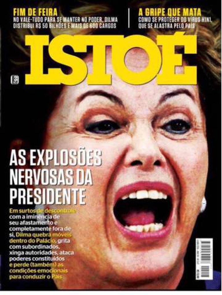Em abril, a revista IstoÉ levou essas críticas ao ponto culminante. Publicou em sua capa a cara de uma Dilma descontrolada, com o título: “As explosões nervosas da presidente”. Um trecho da reportagem: “[Sua] maneira temperamental de lidar com as situações não é nova, embora tenha se agravado nas últimas semanas”. Uma expressão implicitamente machista: Dilma estava histérica.