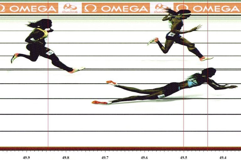 O avanço de Felix, que passava um metro à frente como se estivesse em câmera lenta; a defesa aguerrida de Miller, que não cedia, que não cedia. A linha, que não chegava para nenhuma das duas. A cinco metros da meta, parecia que Felix finalmente ficaria com o ouro dos 400m – o qual somaria a uma coleção que já inclui os títulos dos 200m rasos e dos revezamentos 4 x 100 e 4 x 400 em Londres, e também do 4 x 400 em Pequim 2008. Mas, faltando dois metros, e percebendo que sua derrota seria inevitável, Miller se atirou de cabeça sobre a linha e, após alguns instantes de expectativa, foi declarada vencedora.