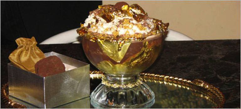Essa absurda moda de colocar pedras preciosas na comida se tornou um filão para a confeitaria Serendipity 3 de Manhattan, em Nova York. Tanto foi assim que se associou com uma joalheria e criaram um sorvete de 81.000 reais chamado “Frozen Hot Chocolate”. Quase 30 diferentes tipos de cacau recoberto de ouro de 23 quilates, servido em taça de ouro e com colher de ouro. Claro que também é possível desfrutar do seu sundae absurdo pelo módico preço de 3.200 reais, também com ouro comestível. Por essas duas besteiras eles entraram no livro Guinness dos Recordes. O que realmente pode nos deixar congelados é que existam cabeças-ocas que realmente comprem sorvetes a esse preço.