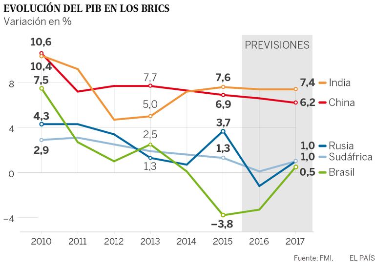 "Das cinco economias BRICS, quatro desaceleraram e até entraram em contração em 2015. A economia da China continuou freando e seu reequilíbrio, da produção de mercadorias até os serviços, pesou sobre o comércio mundial e sobre os preços das matérias-primas. Brasil e Rússia, dois grandes exportadores de matérias-primas, atravessam uma forte contração acompanhada da depreciação de sua moeda, superam suas metas de inflação e suas finanças públicas se deterioram. Na África do Sul, os gargalos crônicos no fornecimento de energia são um fator importante por trás do fraco crescimento." Assim avaliava o Banco Mundial, em um relatório de perspectivas econômicas globais, publicado em janeiro, a frágil saúde do grupo estrela dos emergentes. Salvava-se do perigo a Índia. "O crescimento na Índia continuou sólido, impulsionado por um forte otimismo dos investidores e o efeito positivo nas receitas reais da queda dos preços do petróleo", assinala.