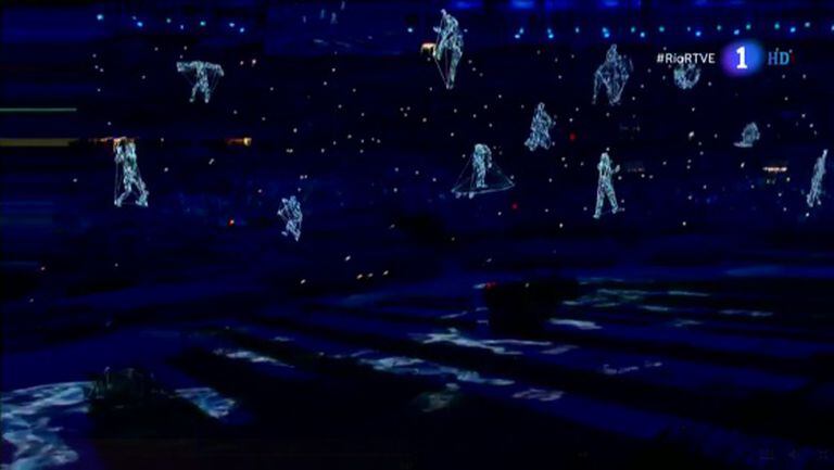 Com robôs, os organizadores da próxima Olimpíada colocaram a bandeira japonesa no centro do estádio, enquanto as luzes marcaram a coreografia de hologramas transformados em bailarinos, numa exibição da alta tecnologia pela qual o Japão é conhecido.