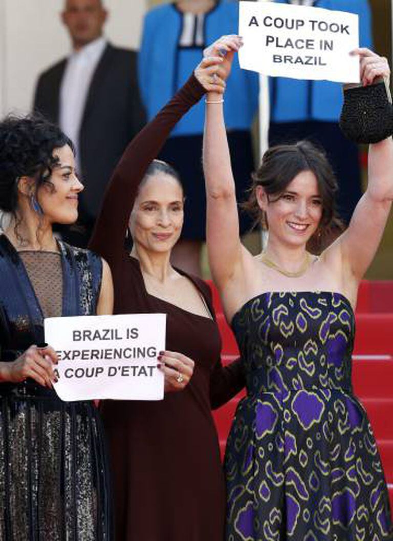 Durante o Festival de Cannes, depois dos primeiros flashes fotográficos, Kleber Mendonça e equipe abriram seus cartazes já no topo da escada, a poucos passos de entrar na sala onde o filme seria exibido. Continuaram a ser fotografados. Sonia, que já tinha entrado, percebeu que algo acontecia e voltou atrás. Quando viu do que se tratava, pediu emprestada uma das folhas amassadas e fez questão de desdobrá-la e fazer-se fotografar, ela também, descontente com os rumos não só do país. “Acho que isso é no mundo todo. Se você pensar na mulher, no direito de estudo, no direito da palavra... Os direitos femininos têm de ser revistos. Acho incrível mesmo que a gente esteja vivendo no século XXI, porque para mim tudo isso é um absurdo”, me diz.