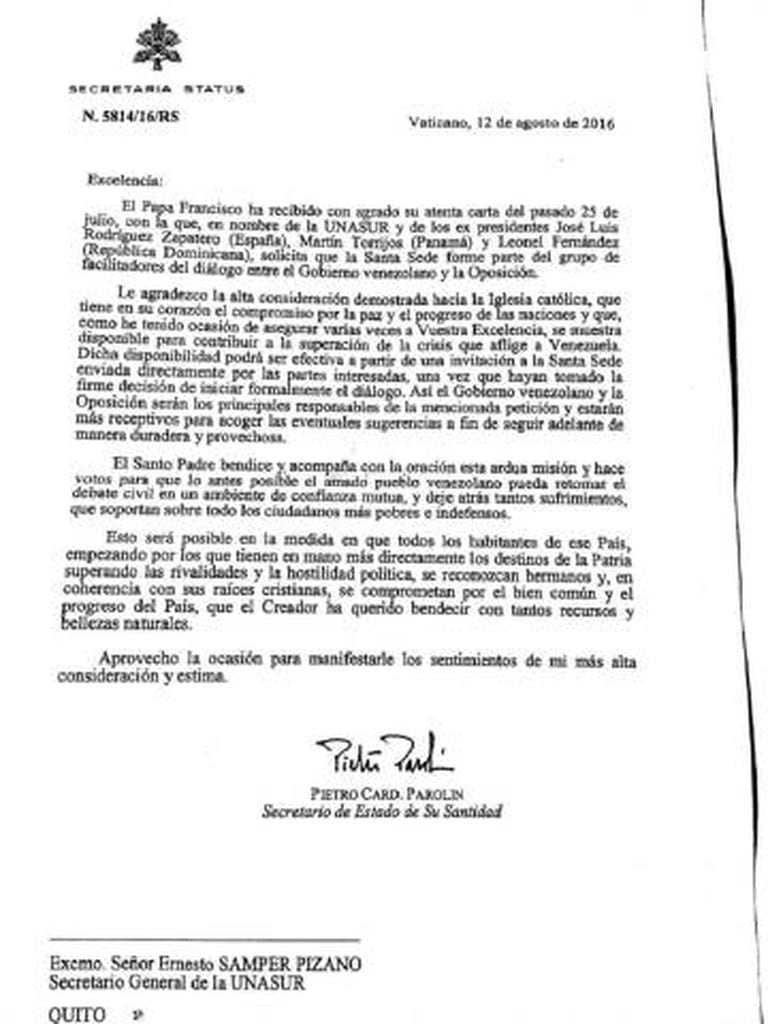 O diálogo entre o Governo e a oposição vai ganhando forma lentamente na Venezuela. O Vaticano confirmou em agosto que aceita ser intermediário em eventuais negociações. O cardeal Pietro Parolín, secretário de Estado do papa Francisco, informou mediante carta ao secretário-geral da Unasul, Ernesto Samper, que a Igreja Católica concorda em intervir na crise e pede às duas partes um convite formal para começar o diálogo, circunstância que ainda não ocorreu.