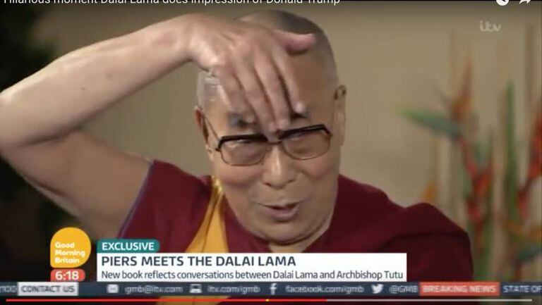 O Dalai Lama, viajando pela Europa, fez uma caricatura de Donald Trump, o candidato republicano à Casa Branca, durante sua participação no programa Good Morning Britain da rede ITV. O entrevistador Piers Morgan pergunta quais são as impressões dele sobre a eleição dos EUA e o próprio Trump. E o líder espiritual tibetano respondeu em poucos segundos com vários gestos que deram a volta ao mundo.