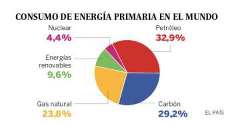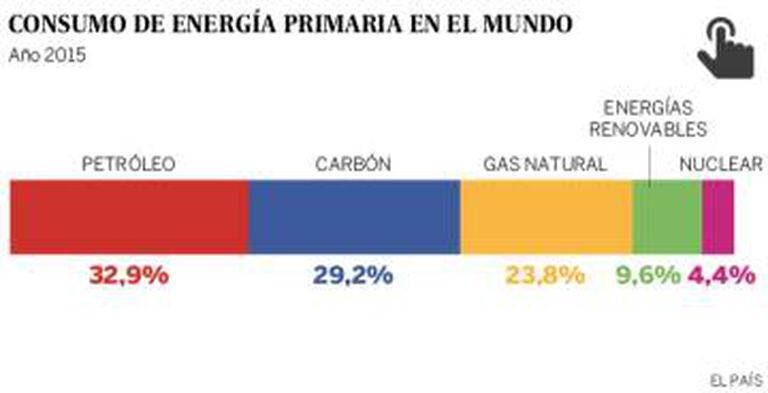 Um relatório publicado neste verão pela BP aponta que, em 2015, o consumo de petróleo cresceu 1,9%, e o de gás, 5,4%, enquanto a demanda de carbono no planeta caiu 1,8%. O mix de consumo global continua preferindo um modelo que use fontes energéticas convencionais: o pegajoso combustível lidera o consumo de energia primária (por volta de 32%), seguido do carbono, com 29,2%, e em terceiro lugar aparece o gás natural, com 23,8%. As energias renováveis têm apenas 9,6% do bolo, e o resto do mercado, 4,4%, fica com a energia nuclear.