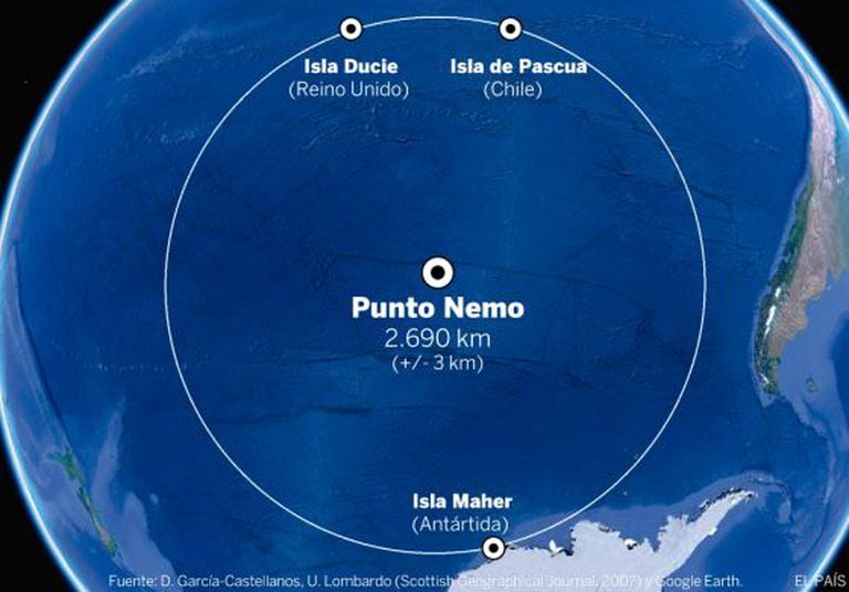 Para desenhar esse ponto imaginário, os geógrafos tentaram encaixar no Pacífico o maior círculo possível sem tocar qualquer terra. O que rodeia Nemo cabe perfeitamente no buraco deixado por três ilhas a 2.690 quilômetros de distância. Terra firme, mas mortalmente chata. A noroeste, o atol Ducie, desabitado, não passa de uma unha de terra, com apenas dois quilômetros, sob bandeira britânica. Muito mais ao sul, Maher serve como antessala da Antártida. Até 1868 ninguém havia colocado os pés nesta ilha, que nem sequer merece imagem própria no Google Earth. Sua posição está apenas anotada em meio a pixels azuis. O terceiro ponto, mais para a nordeste, é a ilhota – também despovoada – de Motu Nui, junto à ilha de Páscoa.
