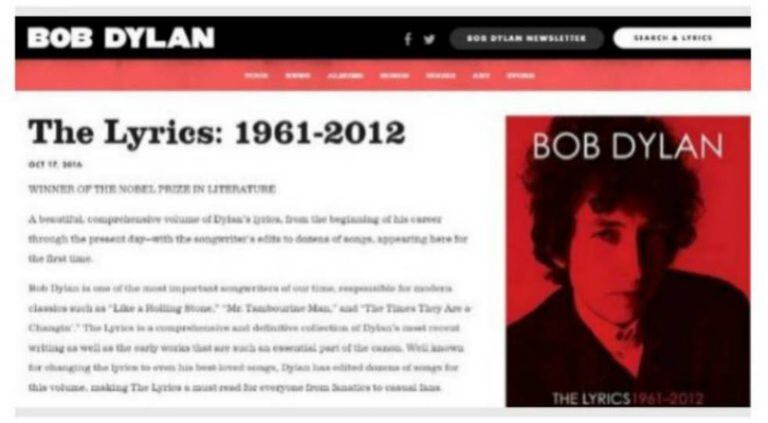 A frase, que aparecia em uma resenha publicada na quarta-feira para promover o livro The Lyrics: 1961-2012, sobre as letras de suas canções, foi a única admissão pública do prêmio por parte de Dylan, que guarda silêncio desde o dia 13 de outubro. Sua decisão deixou inquieta a própria Academia Sueca, que desistiu de fazer contato com ele após várias tentativas de comunicar a distinção pessoalmente, por e-mail e através de amigos. Sem maiores explicações, a frase foi substituída por um link para comprar o livro.