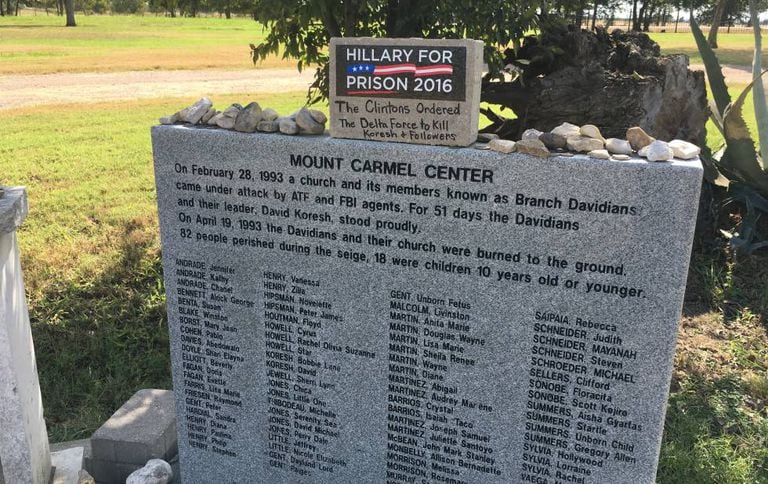 “Trump é muito popular aqui”, diz Pace, que ergueu um pequeno altar na entrada onde estão os nomes de todos os mortos no ataque do FBI. Sobre um dos túmulos, há um cartaz que diz: “Hillary para a prisão – 2016”, reproduzindo um lema da campanha de Trump. E logo embaixo ele escreveu: “Os Clinton ordenaram à Força Delta que matasse Koresh e seus seguidores”.