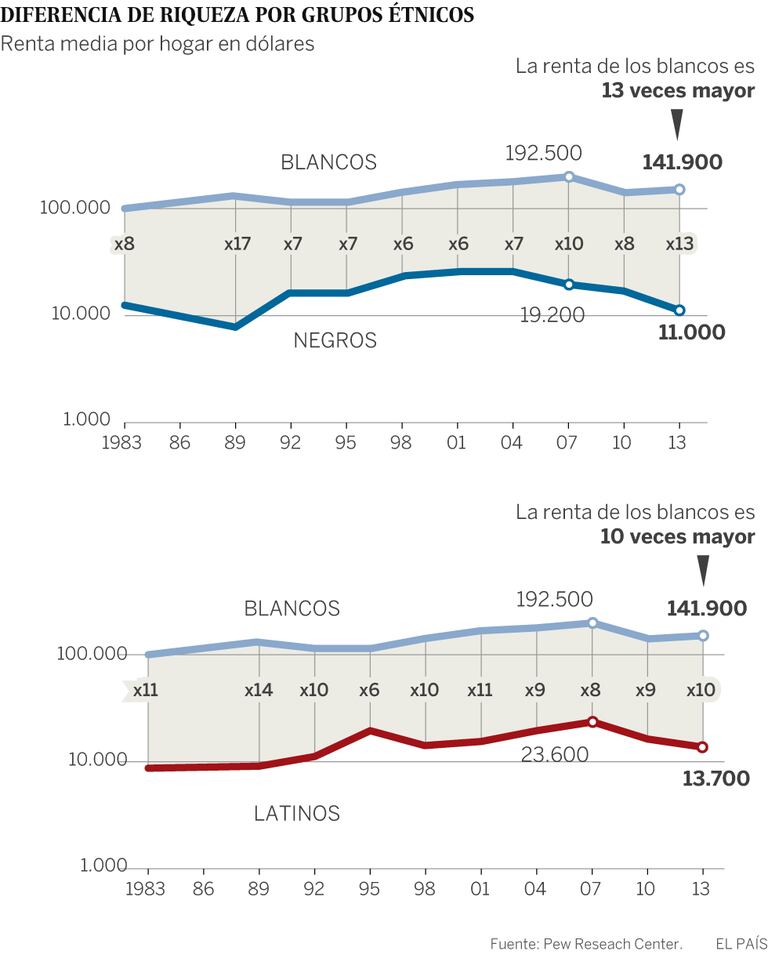 Quanto mais humilde o bairro, piores são os serviços e a saúde. E pior a criminalidade. Em lugares como Nova Jersey, isso significa falar de raça, já que a pobreza castiga muito mais os negros e latinos que os brancos. Com a Grande Recessão, a brecha aumentou em todo o país: o patrimônio líquido médio de uma família branca em 2013 era de 141.900 dólares (cerca de 454.000 reais), enquanto o de uma negra era de 11.000 dólares (35.200 reais) e o de uma latina, 13.700 (43.800 reais), segundo dados do Pew Research. Nos EUA, as coisas ainda são brancas e negras.