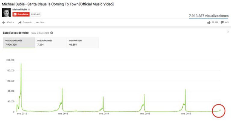 As imagens, retiradas da seção “estatísticas” do vídeo, demonstram como as buscas das canções de natal pop são sazonais: todo ano, elas disparam em dezembro. Mas se prestamos atenção no momento em que o gráfico começa a subir, não no pico, fica claro: desde meados de outubro, já há usuários ouvindo as trovas.