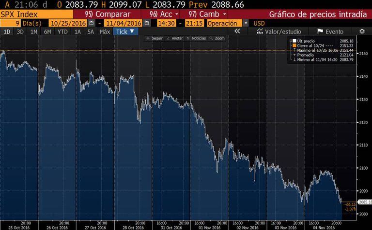 Wall Street não tinha vivido um período de tanta incerteza para os investidores nos últimos anos. O S&P 500 fechou a sexta-feira em queda (-0,16%) e soma nove pregões consecutivos em baixa, a pior sequência em 36 anos. O Dow Jones também fechou com perdas (-0,23%) e já soma sete sessões no negativo. Os bons dados sobre o emprego divulgados na sexta-feira nos EUA não foram suficientes para acalmar os investidores, inquietos desde que as pesquisas sobre as eleições presidenciais norte-americanas começaram a elevar as probabilidades de vitória de Trump. Apesar de as cotações terem subido durante grande parte da sessão, acabaram fechando no vermelho.