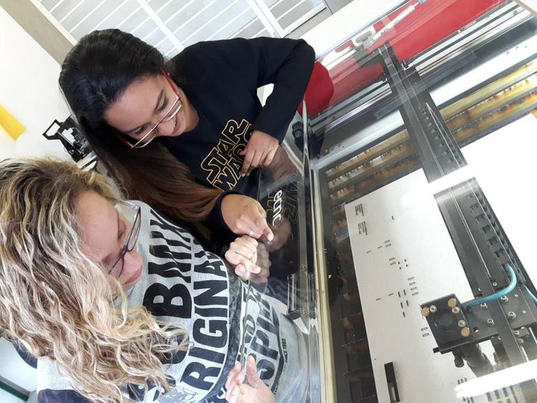 As estudantes de arquitetura Nathallya Martins, 19, e Camila Antunes, 21, frequentam o fab lab localizado dentro do CEU Heliópolis, com o objetivo de utilizar a máquina de corte a laser para montar maquetes de habitação de interesse social para o curso de arquitetura. “Esse equipamento não está disponível em nossa universidade, mas faz muita diferença na qualidade do trabalho”, diz Camila. Elas contam que, por enquanto, foram as únicas de sua turma a utilizar o equipamento. O motivo? Muita gente não conhece os fab labs.