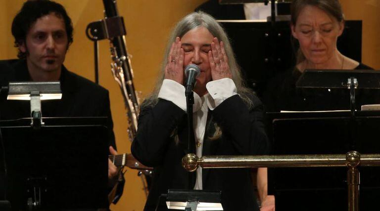 Patti Smith, que se dedicou à poesia e à música maravilhada pela obra de Dylan, como reconheceu em várias ocasiões, ganhou a maior ovação da tarde deste sábado quando terminou sua interpretação de A Hard Rain’s a-Gonna Fall, canção de Dylan de 1963 pertencente ao disco The Freewheelin’ Bob Dylan. Previamente, a orquestra havia tocado distintas peças clássicas depois dos discursos dos ganhadores dos prêmios de Física, Química e Medicina, mas nenhuma alcançou o ponto apaixonado de Patti Smith − que, meio escondida em seus longos e volumosos cabelos brancos, teve de parar no meio da música, visivelmente emocionada. “Sinto muito. Estou muito nervosa, peço-lhes desculpas”, reconheceu diante da plateia, repleta de homens de smoking e gravata borboleta e de mulheres com vestidos luxuosos.