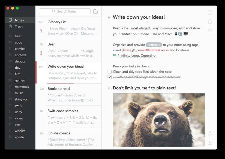 - Bear (iOS): O segmentos dos aplicativos para tomar notas é sem dúvida um dos mais saturados e no que resulta mais difícil abrir espaço. No entanto, um grupo de programadores italianos conseguiu surpreender o mundo apresentando um aplicativo muito semelhante ao Evernote, mas com um funcionamento e uma interface que foram escolhidos pela Apple como o melhor app do ano. Foi, no entanto, Federico Viticci, uma voz muito respeitada no mundo da Apple e fundador da MacStories, que abriu a caixa de Pandora para afirmar que estava pensando em migrar todas as suas anotações para a então desconhecida Bear. O aplicativo está disponível apenas para iOS.