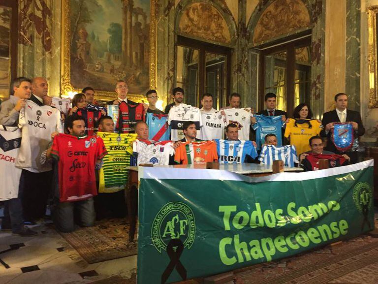 Representantes da maioria dos clubes da Primeira Divisão foram até a residência diplomática para entregar ao embaixador as camisas que 25 equipes utilizaram na rodada de 3 e 4 de dezembro do Campeonato Argentino, quando os times entraram em campo trajando o escudo ou as cores da Chapecoense. O presente viajará a Chapecó (SC) e será entregue às famílias das vítimas. Os clubes que participaram da homenagem são: Aldosivi, Arsenal, Atlético de Rafaela, Atlético Tucumán, Banfield, Belgrano, Colón, Defensa y Justicia, Gimnasia y Esgrima, Godoy Cruz, Huracán, Independiente, Lanús, Newell's Old Boys, Olimpo, Patronato, Quilmes, Racing, Rosario Central, San Lorenzo, Sarmiento, Temperley, Tigre, Unión, Vélez Sarsfield. Só faltaram River, Boca, San Martín de San Juan e Estudiantes de La Plata, embora essas equipes tenham repetido o gesto em caráter individual.