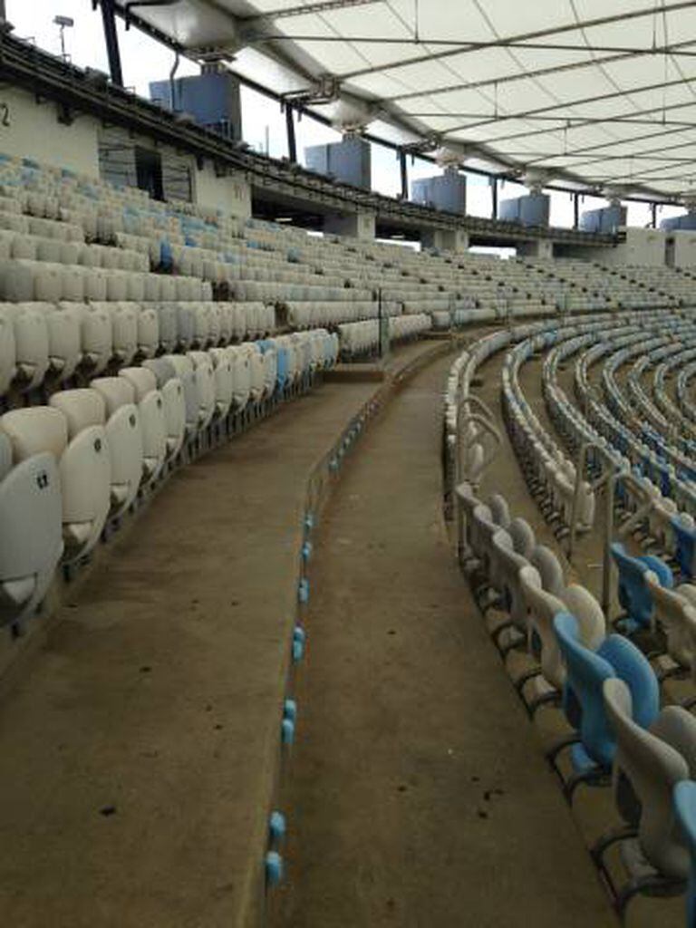 Enquanto os turistas desembarcam, às dezenas, no asfalto fervilhante do entorno do Maracanã, tiram fotos ao lado das bilheterias, compram chaveiros e camisetas da seleção brasileira e aplaudem um imitador de Pelé, o que se vê do outro lado da grade é um estádio definhando em pleno abandono.