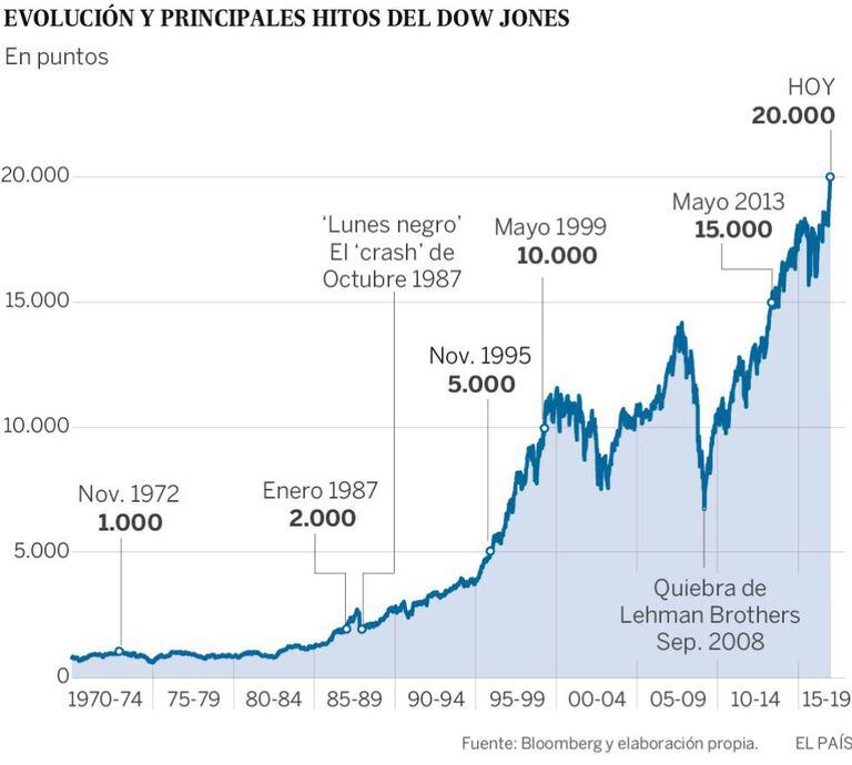 O Dow Jones fechou acima dos 19.000 pontos em 22 de novembro. Bastaram, portanto, somente 42 dias, o segundo incremento mais rápido de 1.000 pontos na história do pregão. Mas estes números redondos, na realidade, são uma amostra da tendência em que se fixam os operadores do pregão. O que está para se ver agora é quanto tempo poderá se manter nesse nível. O Dow Jones cruzou pela primeira vez os 10.000 pontos quando se formava a bolha tecnológica. Mas levou uma década para voltar a alcançar esse nível e sentar as bases para começar a crescer.