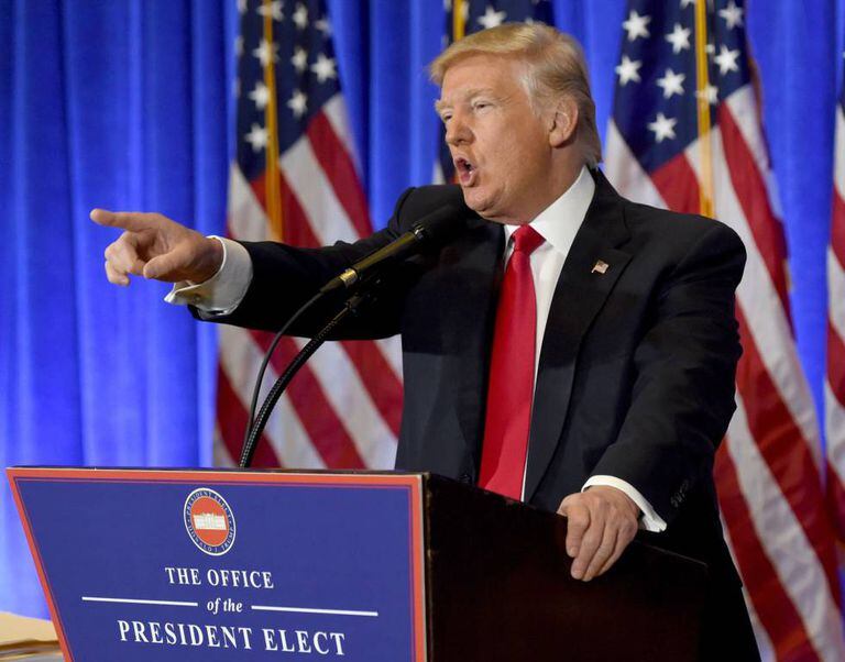 Foi sua primeira coletiva em seis meses, pouco mais de uma semana antes de se tornar o presidente número 45 dos Estados Unidos. Na Trump Tower, em Nova York a expectativa era máxima. O presidente eleito apareceu acompanhado do vice-presidente eleito Mike Pence e de seus filhos Don Junior e Eric, além da equipe de advogados encarregados de avalizar suas decisões para dissipar as suspeitas sobre seus conflitos de interesse.