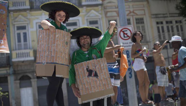 O brasileiro é invencível. Foliões fantasiados de Muro de Trump.