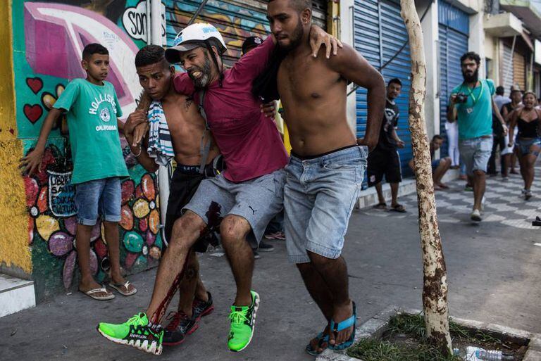 A cracolândia, região de constantes conflitos na zona central de São Paulo, viveu mais um dia de violência nesta quinta-feira. A Polícia Militar jogou bombas de efeito moral contra usuários de crack, que atiraram contra eles pedaços de pedras e de paus. Um fotógrafo foi atingido por uma bala de arma de fogo enquanto trabalhava no local e está hospitalizado. Segundo a Secretaria de Segurança Pública de São Paulo, seis policiais se feriram, mas não há maiores informações sobre o estado de saúde deles. A reportagem também presenciou ao menos dois usuários machucados, um com um inchaço no braço e outro com um corte na cabeça.
