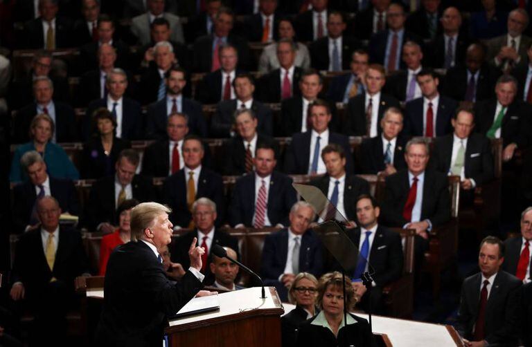 Sua intervenção foi uma prova de fogo. Com a avaliação mais baixa da história para um presidente em começo de mandato, Trump precisava recuperar a iniciativa e insuflar novos brios em parte dos republicanos. Mas também precisava responder a uma nação que aguardava com ansiedade uma explicação quanto aos desafios que ele mesmo propôs: o destino dos imigrantes em situação irregular, o fim da cobertura sanitária, a corrida nuclear, o terrorismo islâmico, as explosivas relações com o México, China e Irã. Sob a cúpula do Capitólio fervilhavam as grandes perguntas sobre a política próxima e distante. Trump sabia disso, e ao longo de uma hora foi passando por cada uma dessas perguntas, com a mandíbula tensa, mas sem perder as estribeiras, até encurralá-las num canto do ringue.