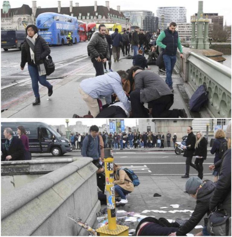 A fotografia mostra o atendimento a uma vítima do atentado de Londres. Há um pequeno grupo de pessoas à sua volta. Ao lado, passa uma mulher com lenço na cabeça e um celular na mão. Isso é tudo o que sabemos. Mesmo assim, essa mulher foi acusada de indiferença –o que, na verdade, evidencia o olhar tendencioso de quem interpreta a foto dessa maneira.