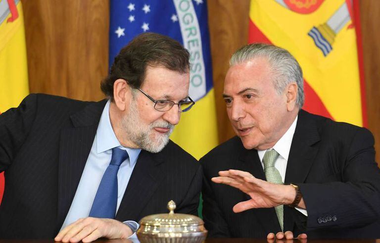 O presidente Michel Temer destacou nesta segunda-feira diante do Primeiro-ministro da Espanha, Mariano Rajoy, a “semelhança” nas dificuldades que os dois países enfrentam e colocou as políticas aplicadas por seu convidado como modelo a seguir. Temer não se referia à corrupção, apesar de ambos os mandatários estarem cercados por escândalos de financiamento ilegal de seus respectivos partidos, e sim à grave crise econômica da qual a Espanha ainda se recupera e à recessão que o Brasil sofre desde 2014 e da qual espera sair timidamente esse ano.