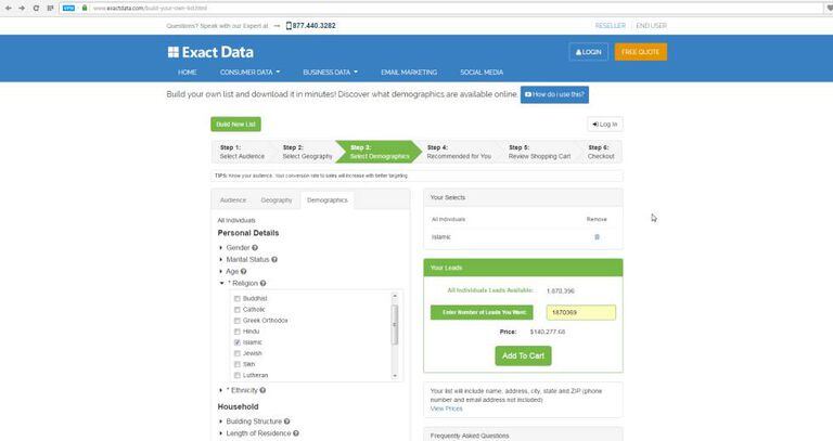 Uma equipe de pesquisadores da Anistia Internacional (AI) revela a oferta, por parte de uma dessas empresas, a Exact Data, dos dados de 1,8 milhão de muçulmanos por 138.380 dólares (cerca de 430.000 reais), ou seja, à base de 7,5 centavos de dólar por pessoa. A empresa em questão “teria uma base de dados total de 200 milhões de contatos dos Estados Unidos que podem ser filtrados por 450 categorias, tais como etnia ou religião”, detalha o relatório. Os dados foram comprovados pelo EL PAÍS na web. O site, ExactData.com, também oferece “um leque de listas de contatos pré-configurados”, como, por exemplo, a de “norte-americanos hispânicos não-assimilados (referência aos que não estão integrados na sociedade dos EUA, independentemente de sua situação legal)”.