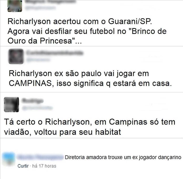 Pela internet, embora a maioria dos torcedores tenha demonstrado apoio à chegada de Richarlyson na página oficial do Guarani no Facebook, tanto rivais quanto bugrinos publicaram insultos e piadas homofóbicas sobre o volante. O vereador Jorge Schneider (PTB) também foi criticado por ironizar a contratação na rede social: “A pessoa certa no lugar certo”, comentou. A assessoria de imprensa de Schneider, que é torcedor da Ponte Preta, rival do Bugre em Campinas, explica que ele foi mal interpretado ao fazer uma brincadeira sobre futebol e afirma que o vereador não teve a intenção de ofender o atleta.