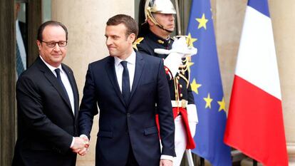 Macron chegou ao Eliseu, onde Hollande o recebeu. Cinco minutos depois começou um encontro privado no gabinete do presidente. A entrevista se estendeu por meia hora além do tempo previsto. Ambos saíram juntos depois das 11h. Depois, Macron acompanhou Hollande até o carro no qual deixou sua residência dos últimos cinco anos. Em sua primeira parada, já como cidadão, Hollande foi a sede de seu abalado partido, o socialista, na rua Solferino, como fez François Mitterand ao deixar o poder em 1995.