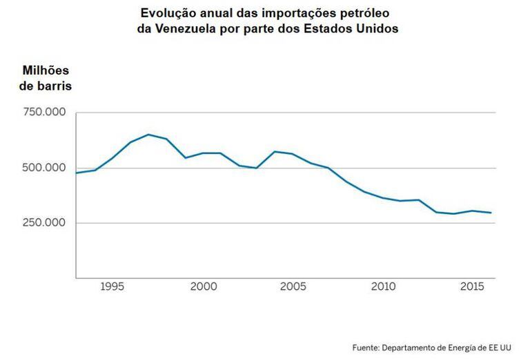 A Venezuela – que possui as maiores reservas mundiais do hidrocarboneto – exportou em 2016 aos EUA 30% de sua produção e atendeu a 4% da demanda norte-americana, segundo dados da agência Bloomberg. No ano passado, o envio de barris caiu a seu nível mais baixo desde 1991 devido a dificuldades na produção venezuelana, mas o país mantém uma cômoda vantagem em relação a México e Colômbia, que são o quarto e o quinto maiores fornecedores de petróleo aos EUA, respectivamente,.